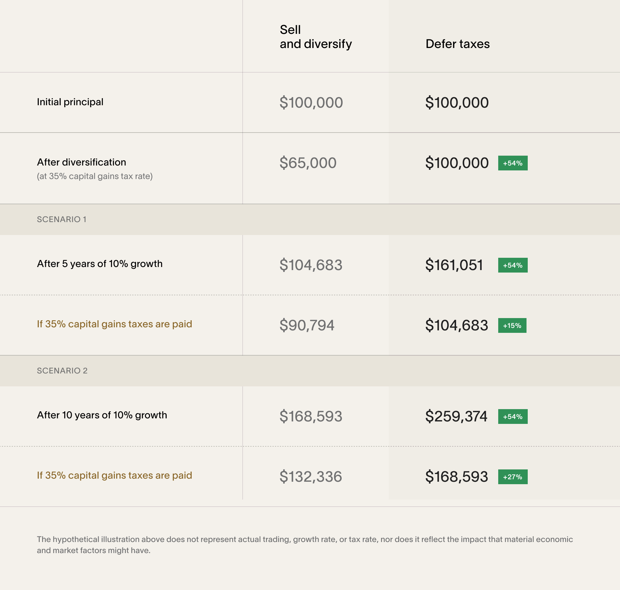 If the Facebook engineer managed to diversify his holdings without resorting to a sale, his $100K investment would be valued at 54% more than in the scenario where he paid taxes to diversify—assuming the same 10% growth rate over five years.