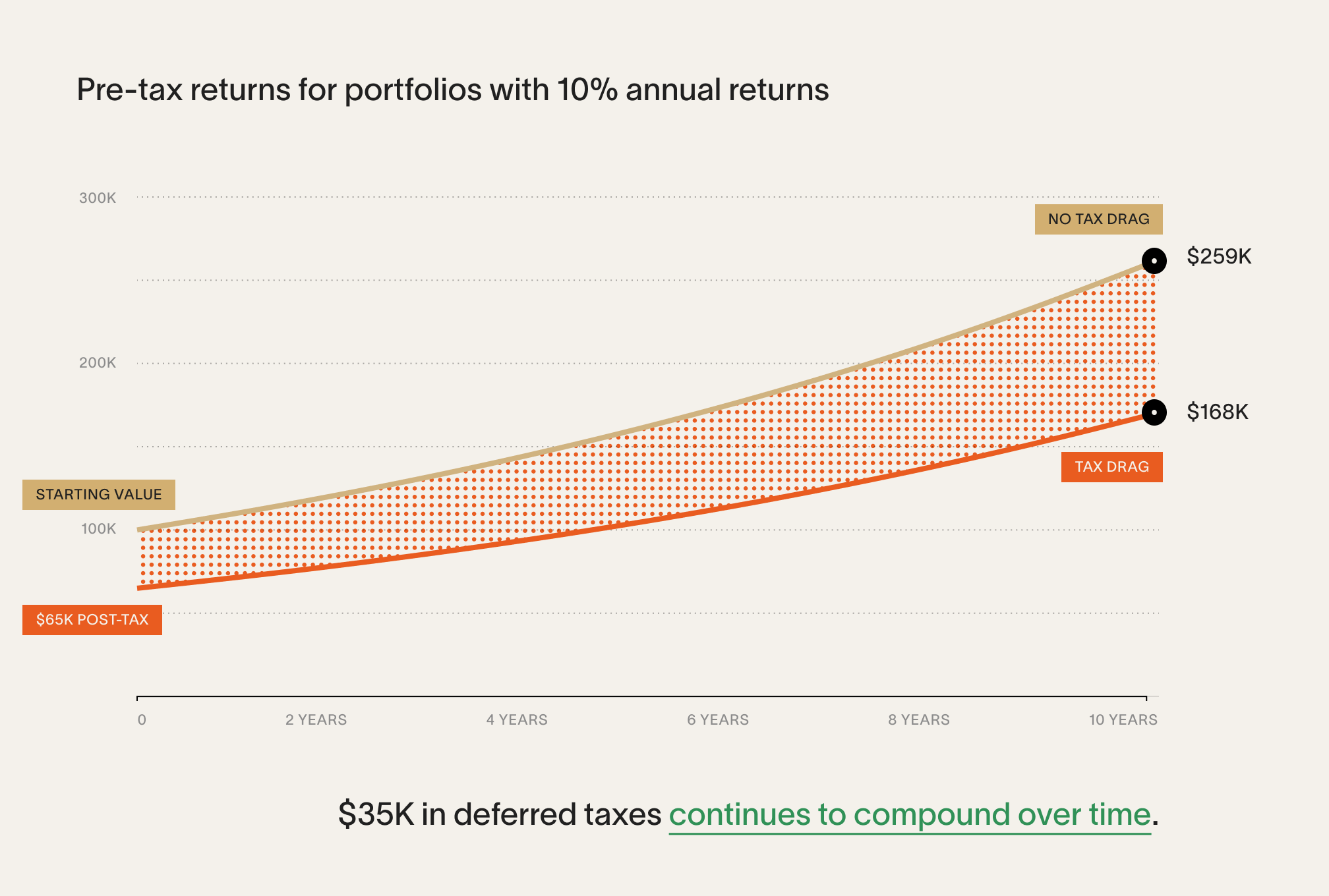 As demonstrated in the example above, the influence of compounding returns would persist over time for the Facebook engineer. If he delayed selling and paying taxes on his tax-deferred portfolio for 10 years, his post-tax returns would be nearly 27% greater than if he paid taxes upfront. The impact of compounding interest becomes evident when plotting the 10% returns over time on a chart.