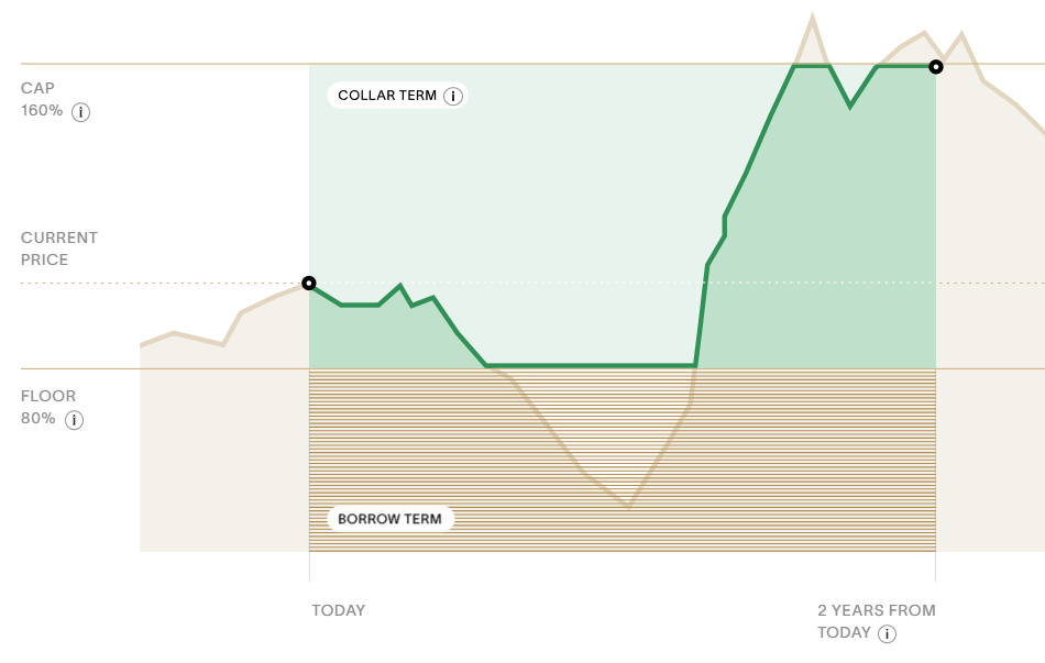 With a 80%–160% collar, for example, you are protected on the downside below 80%, while participating in the upside up to 160%. Unlike other stock loans, you do not need to worry about margin calls or depositing additional collateral.